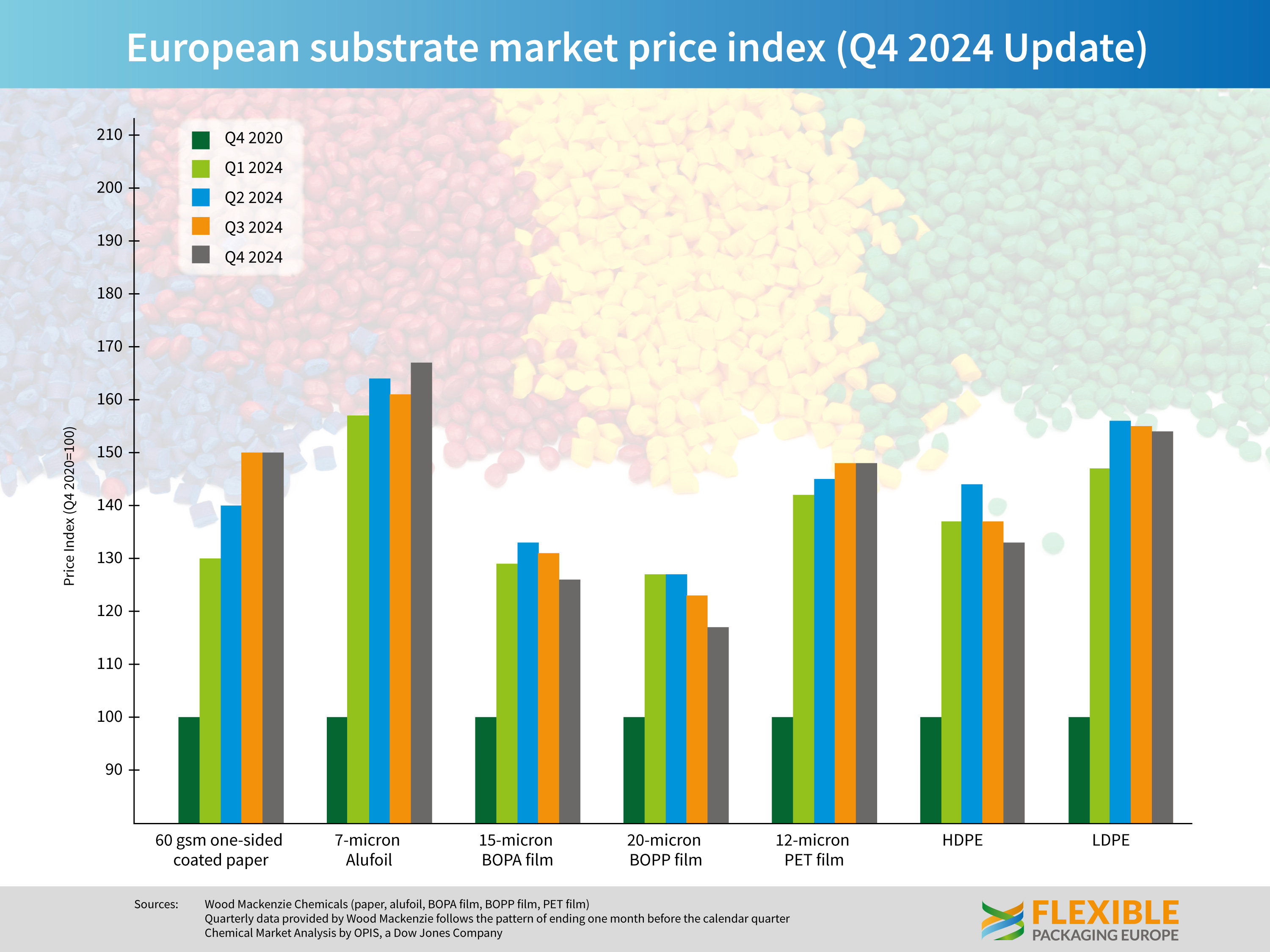 Both 60 gsm one-sided coated paper and 12-micron PET film remained unchanged against Q3 2024 figures, while there was a 4% increase in the price of 7-micron aluminium foil driven by strong demand and China cancelling export tax rebates as of 1 Dec 2024. Modest decreases on the preceding quarter were seen for 15-micron BOPA film (4%); 20-micron BOPP film (5%); HDPE (3%); and LDPE (1%).