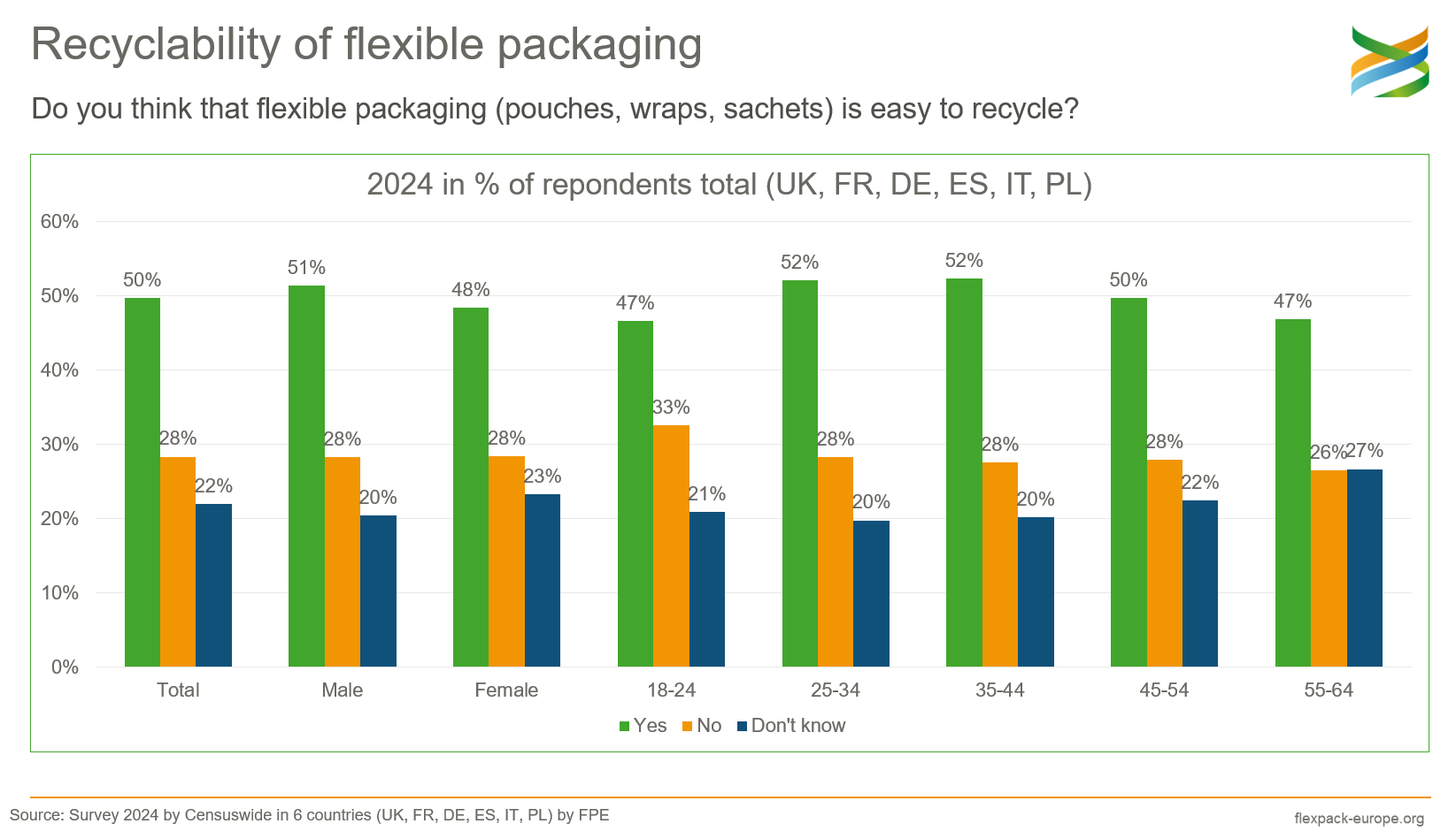 With regard to sustainability, half of all respondents answered that they perceive flexible packaging as recyclable. While there are some differences between countries, e.g. 65% in Spain, 58% in Italy, 40% in Germany and 38% in Poland, the differences between age groups and genders are only marginal.