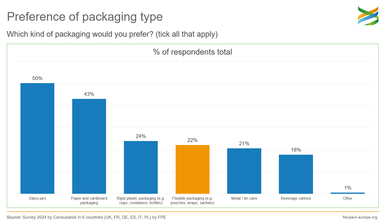 As expected, the strongest preferences were for the individual types of packaging, with glass and paper packaging mentioned by 50% and 43% of respondents respectively. This was followed at some distance by rigid plastic and flexible packaging with 24% and 22% of mentions respectively, but still ahead of metal packaging and beverage cartons.