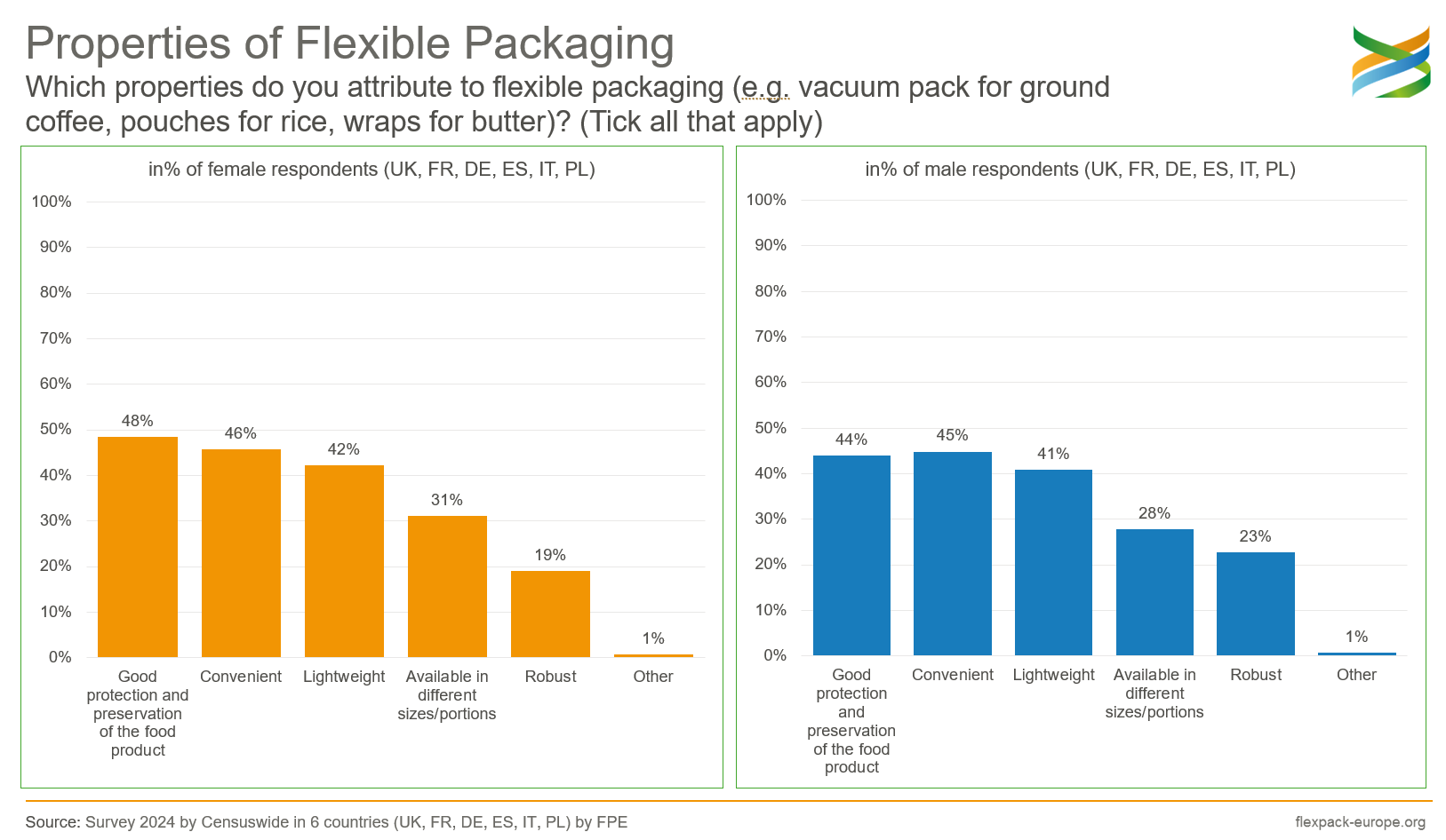 When asked about individual benefits such as product protection, convenience, low weight, availability in different sizes and stability of flexible packaging, women showed a slightly higher level of agreement