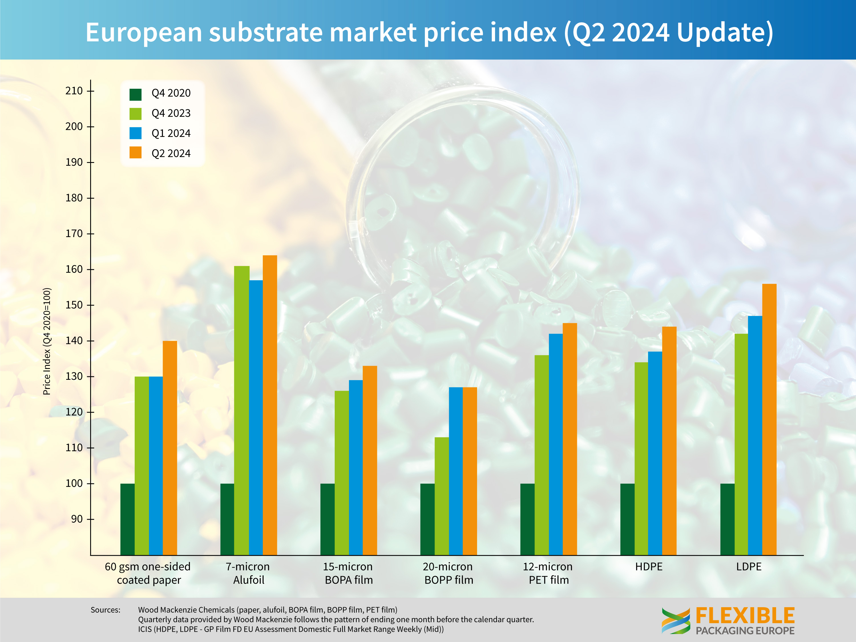 The price of flexible packaging materials across Europe continued the slow increase seen in Q1 as demand continued to rise for most substrates in the three months to end June 2024. Prices were also affected by supply side cost rises for both raw materials and logistics services.